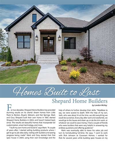 Adding unique touches to every homes can make life easier for you by adding additional storage, oversized garages, or a stand alone ice maker. Every home from Shepard Home Builders is custom built from concept to completion. Having built many homes in Pulaski County, Saline County and Hot Springs County, Shepard Home Builders have become close friends with many of their customers. With unlimited access and communication, Mark and Cory Shepard have a reputation for quality and integrity second to none.